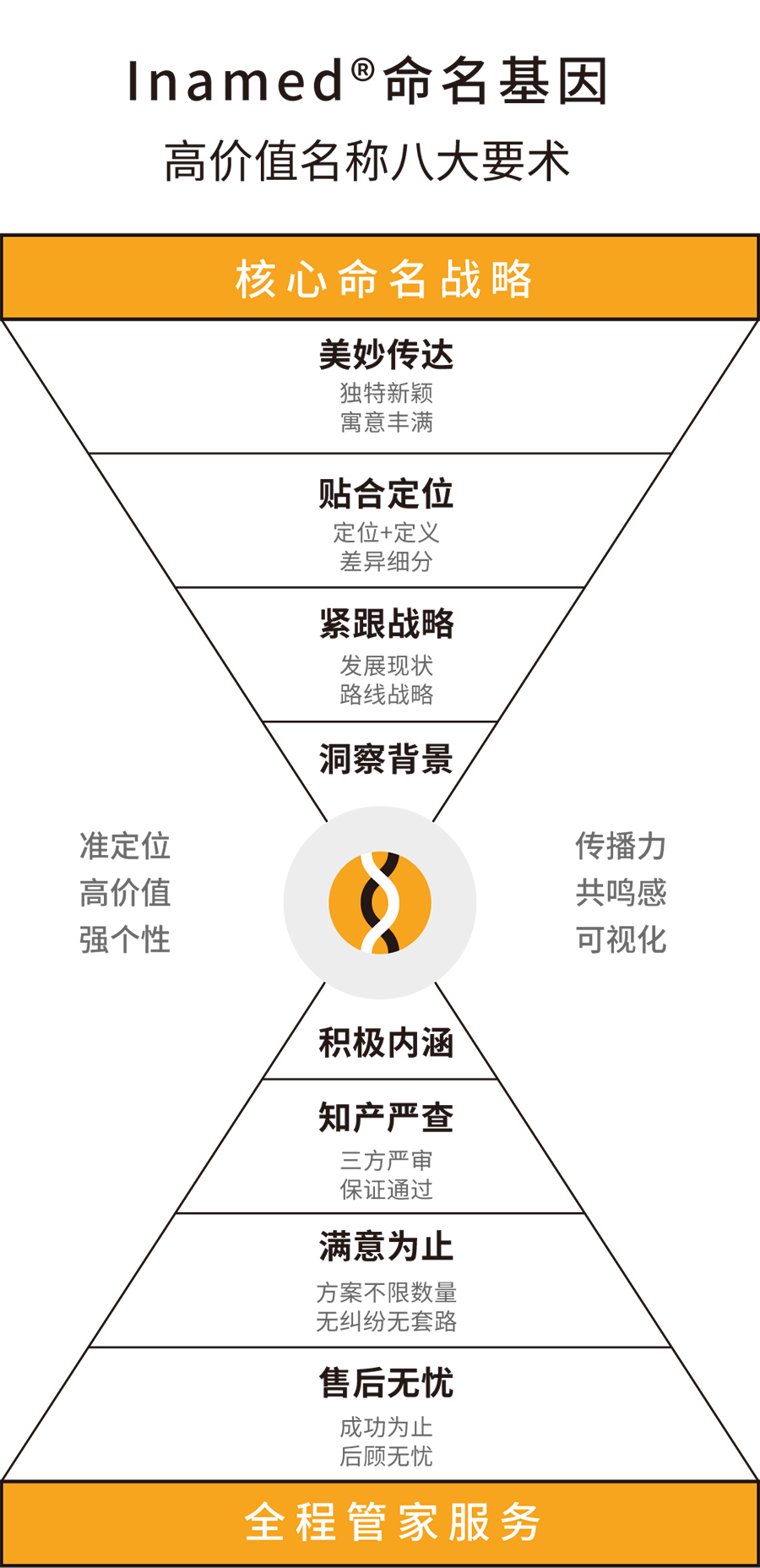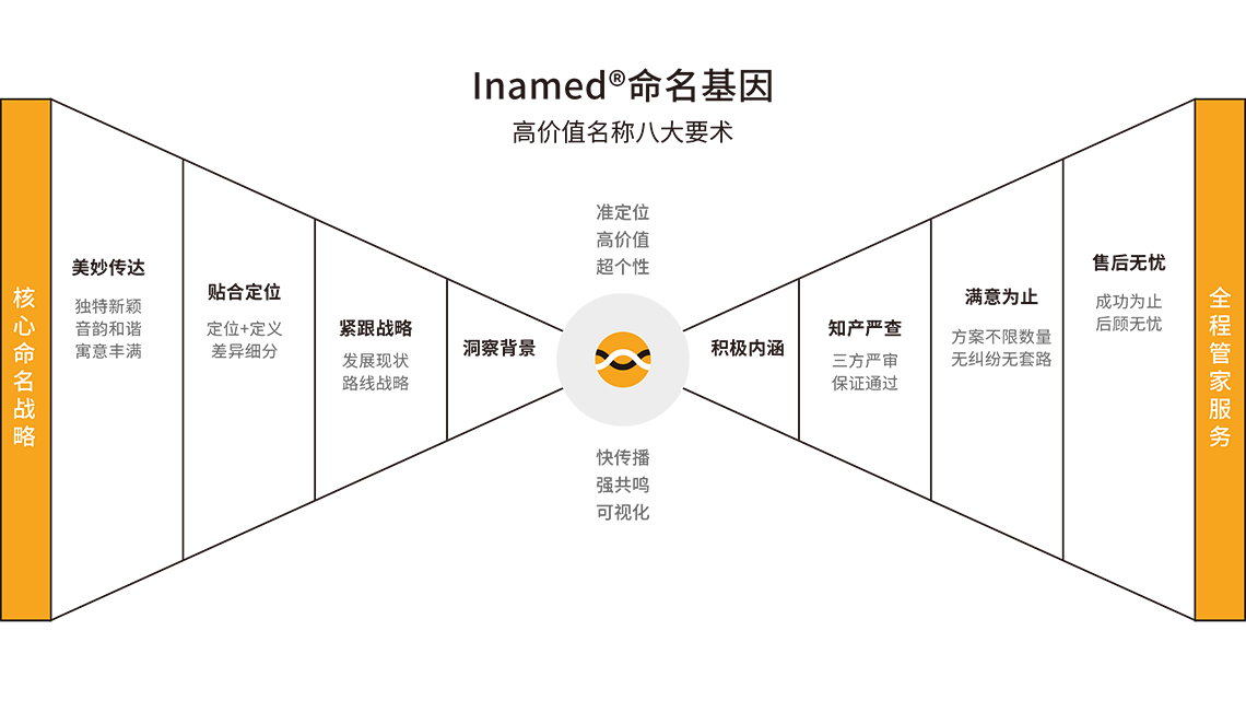 根據(jù)目標群體需求特征以及品牌起名定位,通過字義、字音、字性等多種方法,創(chuàng)意命名方案;對名稱進行商標注冊系統(tǒng)篩查等。