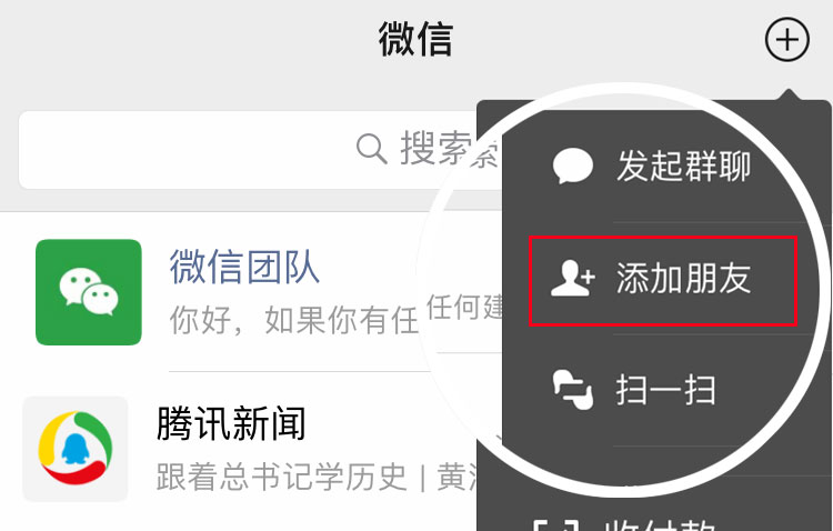 打開微信,點擊右上角“+”,點擊“添加朋友”,粘貼微信號即可